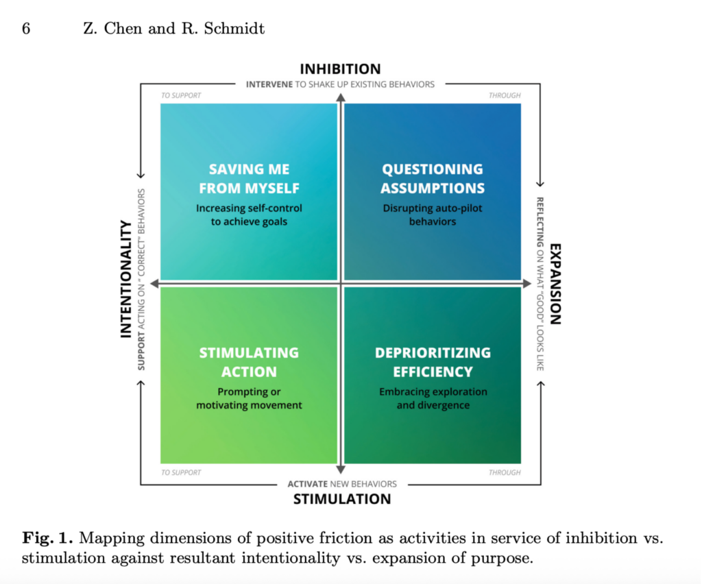 Maha Bali: Yeah, I thought that was really interesting….the study is talking about positive friction, when friction is actually useful. Friction can be positive when it stops something, or when it stimulates something. And it can be something that makes things bigger or smaller: helping people increase self-control to achieve goals, versus stopping you from doing autopilot behavior and encouraging you to question assumptions.